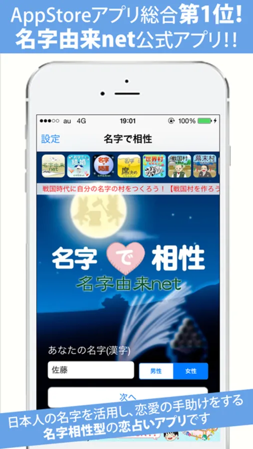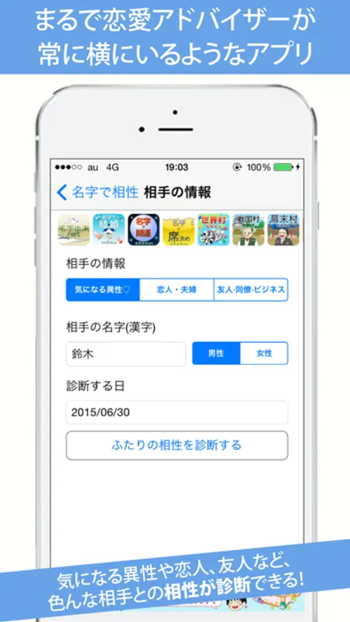 ・「名字で相性」アプリ(名字由来net公式アプリ)は、名字で、自分と恋の相手の相性を診断し、「1日」又は「1ヶ月」の中で最も恋愛運の良いタイミングを教えてくれるアプリです。30万種存在するといわれる複雑な日本人の名字の相性を活用し、恋愛の手助けを目的として開発された、名字相性型の恋占いアプリです。