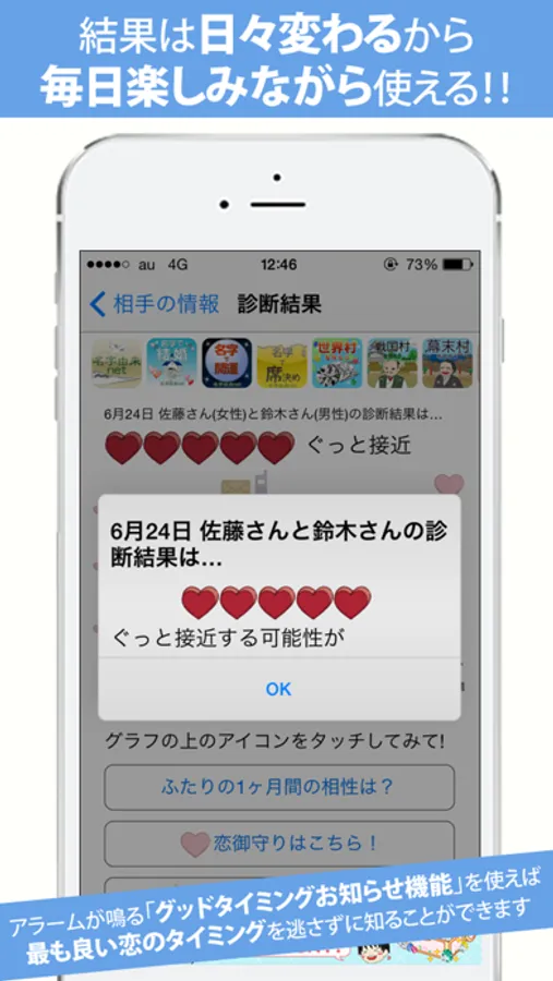 ・さらに、「告白・プロポーズに最適な時間」「仲直りに最適な時間」「お別れ後のやり直しに最適な時間」まで知ることができるので、恋愛で悩んだときに、とても頼りになるアプリです。