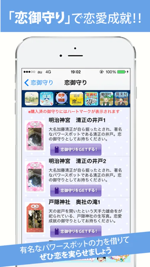 ・「恋御守り」として、日本各地の強力なパワースポットの御守写真を購入することができます。