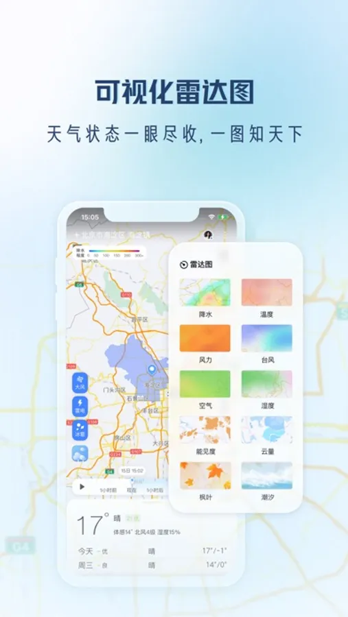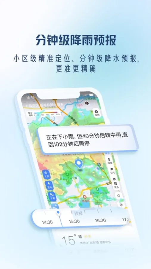 分钟级预报和降雨地图——未来降水预报,精准到分钟级别。用户所在街道,每时每刻雨雪变化,尽在掌握;