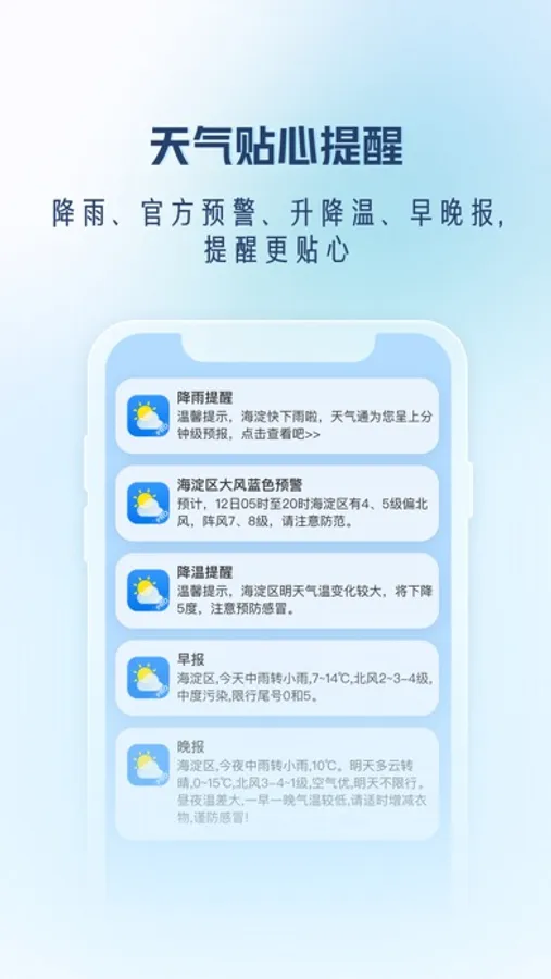 天气预警提醒:实时天气预警信息第一时间掌握,由气象部门授权数据信息,精准涵盖市县区。