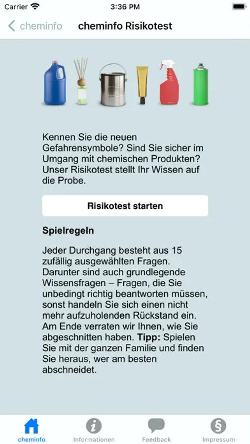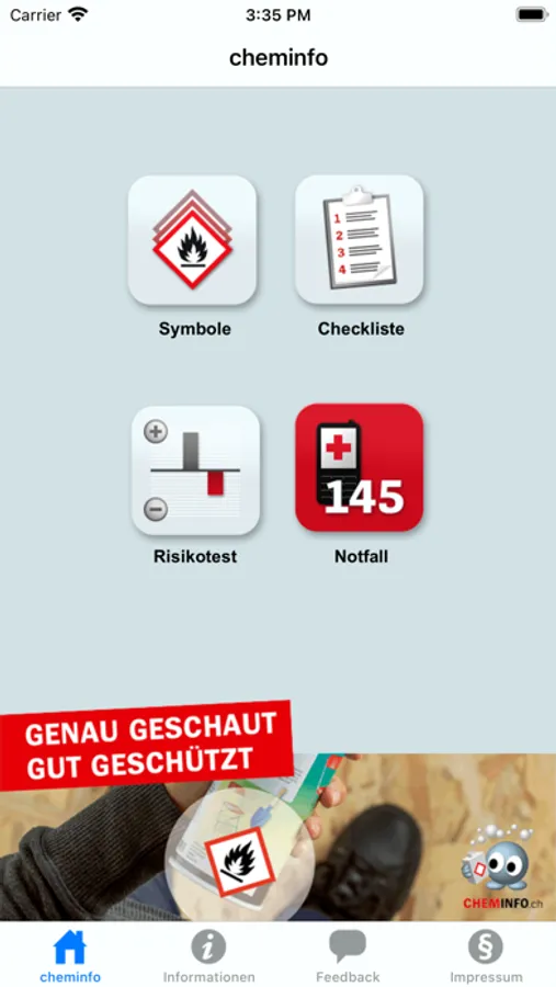 Sie ist Teil der Kampagne „Genau geschaut, gut geschützt“ und ist als unverzichtbare Begleiterin für den Alltag gedacht: die Mobile App von cheminfo.ch. Die kostenlose App beinhaltet alles, was man rund um die neuen Gefahrensymbole und den Umgang mit chemischen Produkten wissen sollte. Neben den Erklärungen rund um die neuen Gefahrensymbole, gibt die App Auskunft über das richtige Verhalten im Notfall – inklusive eines Direktwahl-Buttons für die Notfall-Nummer 145 (Tox-Zentrum). Eine Checkliste hilft beim Einkauf, der Benutzung sowie der Lagerung und Entsorgung von Chemikalien. Und als exklusives Feature hat die App einen Risikotest zu bieten: Anhand von zufällig ausgewählten Fragen kann jede und jeder sein Wissen testen und so sein zukünftiges Verhalten verbessern.