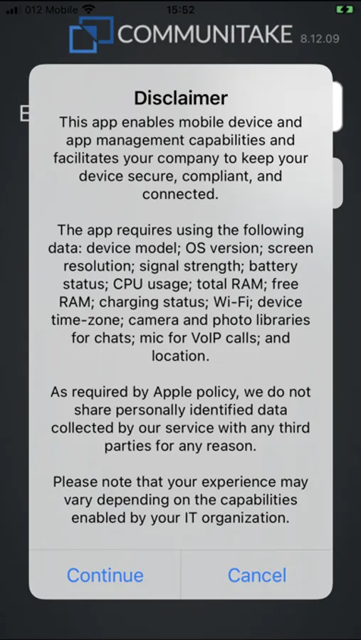 In order to use this application, the device must be registered in CommuniTake's MDM system