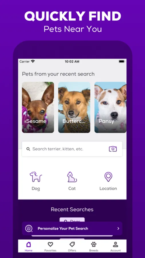 New! Find a pet from photos. Our new visual search feature allows you to upload a photo of a pet and search for similar-looking dogs or cats across the country.