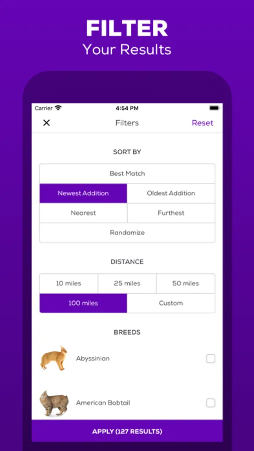 - Filter based on pet characteristics and lifestyle preferences to find the right pet for you