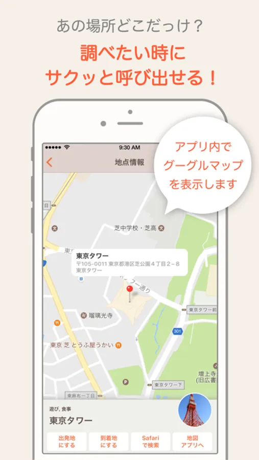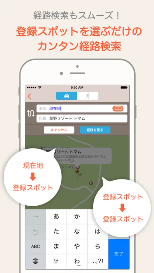 登録した地点を詳しく見たい時はボタン1つで地図アプリへ連携でき、また、ある地点から別の地点への経路を調べたいと思った時も、簡単に経路を設定して地図アプリで表示することができます。
