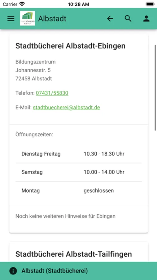 Der mobilOPAC ist ein Angebot der jeweiligen Bibliothek. Für den Inhalt ist die gewählte Bibliothek verantwortlich. Für weitere Informationen oder einer Kontaktmöglichkeit wählen Sie bitte in der App den Menüpunkt "Bibliotheksinfo" aus.