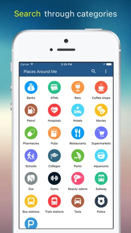 Places Around Me helps you to find any place near to your location. You may be at any location , Places Around Me will help you to find any near by ATM , Hotels , Banks , park , School , etc . The App also allows you to enter a specific search criteria like 'XYZ Restaurant'.