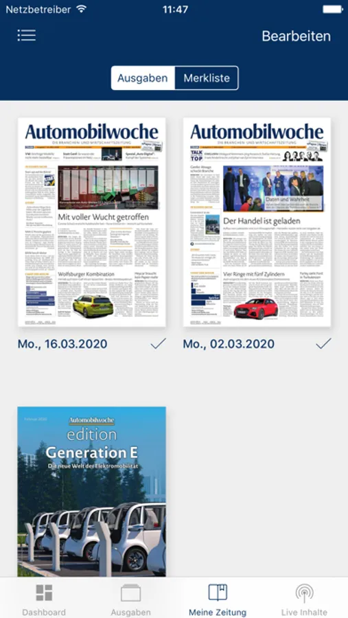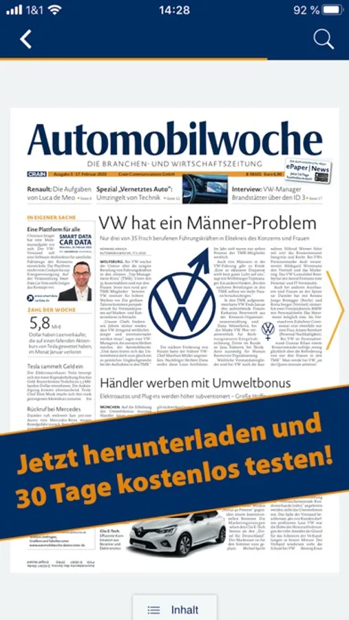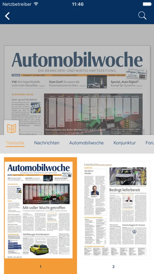 Lesen jetzt die Automobilwoche, Deutschlands einzige Wirtschafts- und Branchenzeitung für den gesamten Automobilsektor, bequem mit unserer E-Paper-App, wo und wann Sie wollen! Lesen Sie schon montags ab 6:00 Uhr die aktuelle Ausgabe der Automobilwoche und verpassen auch keine Sonderhefte.
