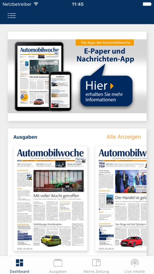 Wenn Sie ein PREMIUM- oder E-Paper-Abonnent der Automobilwoche sind, erhalten Sie Zugang zur App. Tippen Sie auf eine Ausgabe und tragen Ihre Zugangsdaten in den entsprechenden Formularfeldern ein. Bei Fragen hilft Ihnen gerne unser Support: