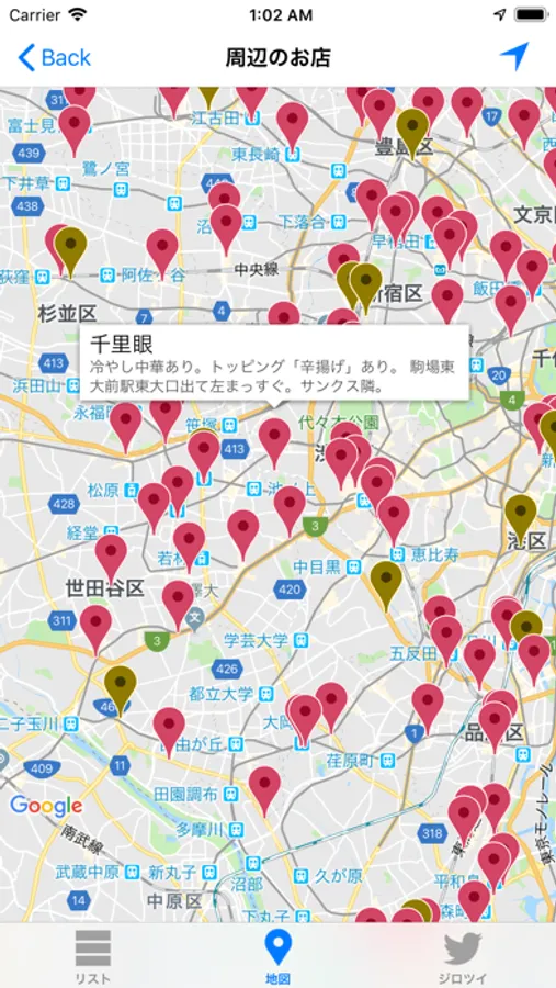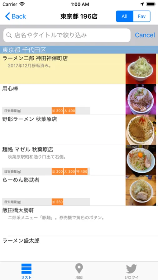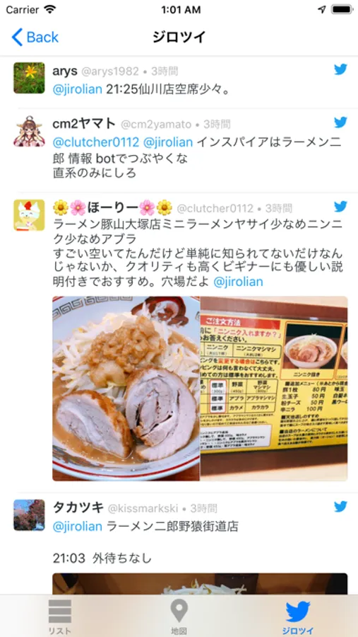 また、ラーメン二郎直系店に関するTwitterの検索結果を表示して、店舗の待ち人数や臨時休業などのツイートを確認できます。