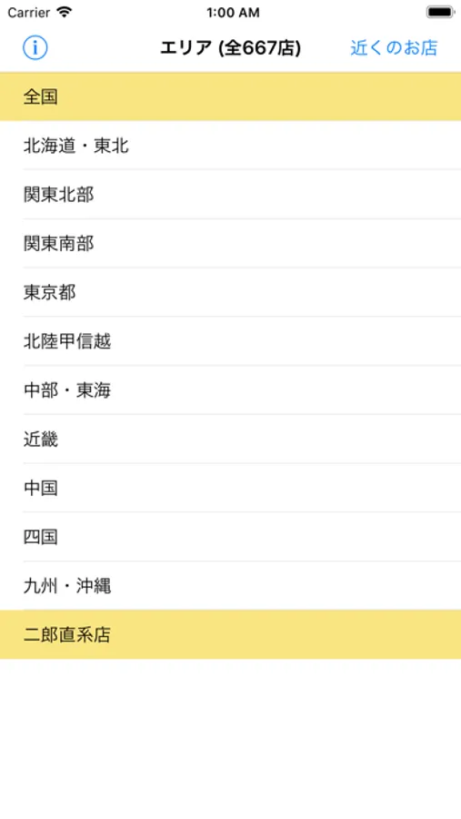 「近くのお店」をタップして、自分の今いる位置から数kmの範囲にあるお店をマップで調べることができます。