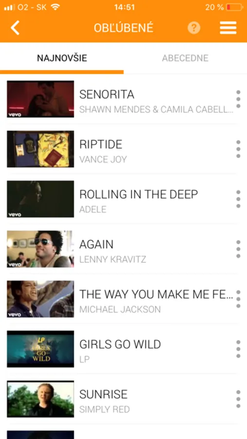 Zoznam skladieb, ktoré si si pridal medzi svoje obľúbené. Môžeš si ich zoradiť od najnovšieho alebo abecedne. Skladby si môžeš takisto prehrať, každá skladba sa prehrá ako Youtube video.