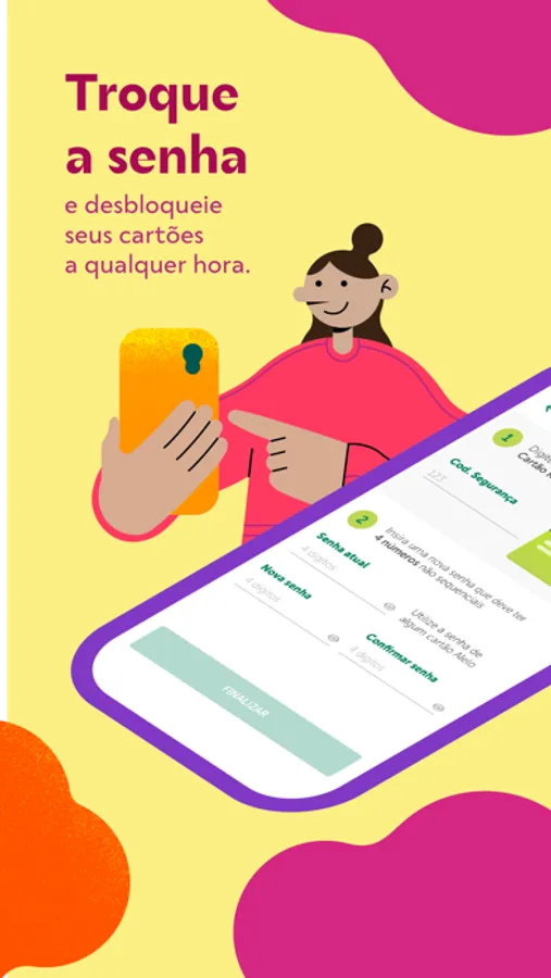 Acompanhe seus gastos pelo extrato, desbloqueie e troque a senha do seu cartão e até peça um novo caso precise.