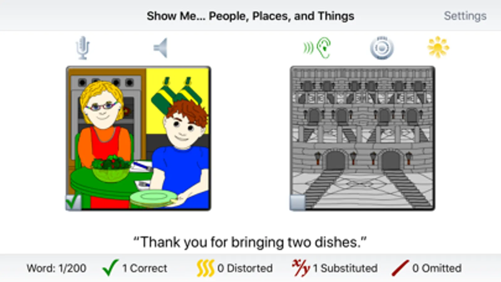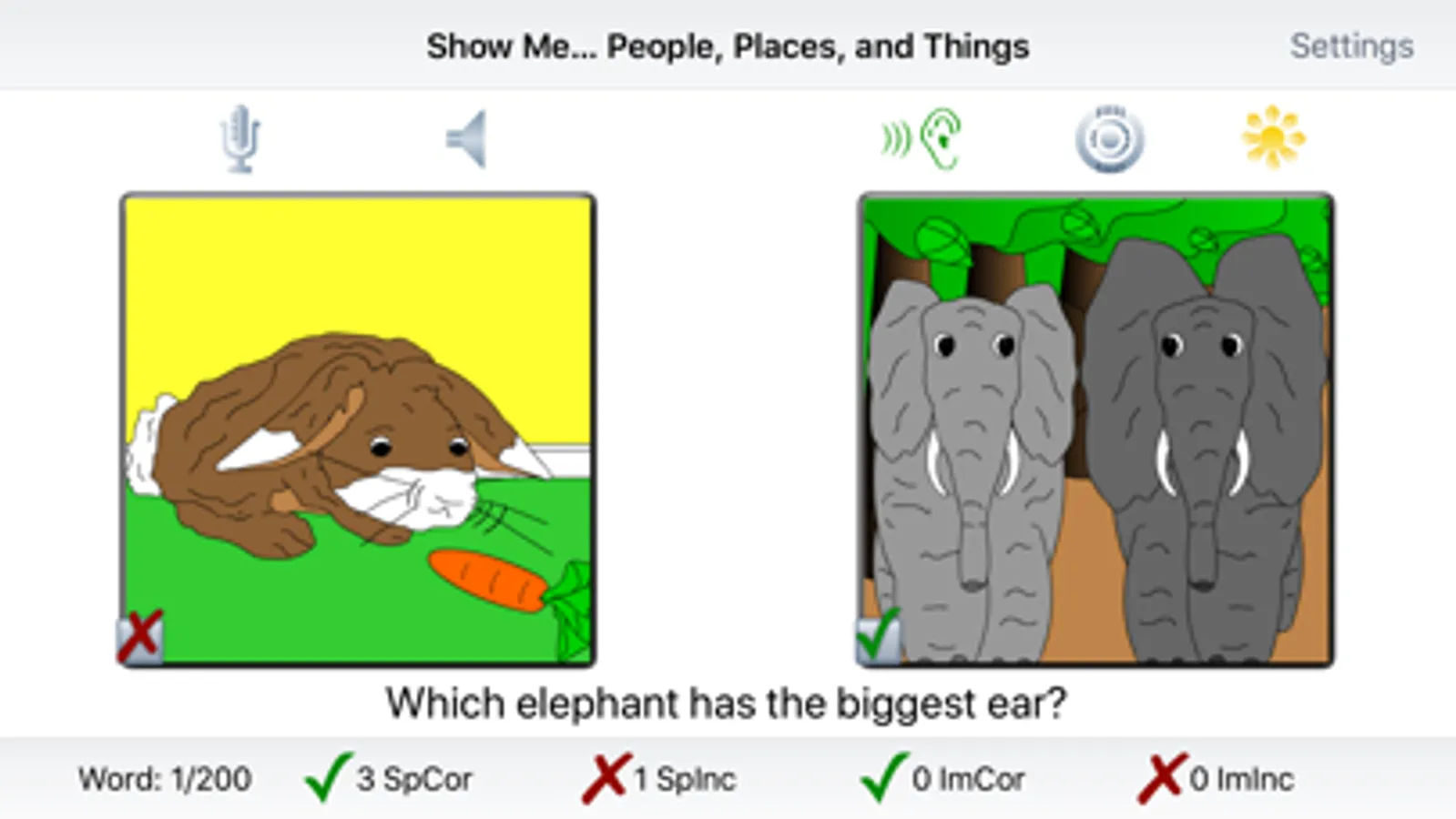 Clues to the correct answer would be a glass of juice or a bandage on a knee. Some prompts are more difficult. “Show Me… It’s warm outside.” doesn't have a “warm” object in the picture but the children in the picture are wearing shorts and eating popsicles. You can help the child draw inferences from the scene to determine which picture is the best match for the prompt. Occasionally there will be a prompt that could apply to either picture. For example, “Ty has a sister named Serena.” is associated with a picture of Ty and Serena and their family. But another picture is labelled “Serena has a brother named Ty.” and shows them picking flowers together. If they should happen to come up on the same screen, both of them are the correct answer to the “Show Me…” prompt but only one is the target. When this happens, you can explore the concept that in games, just like in life, sometimes there is no right or wrong answer. This would be a good opportunity to understand why it is sometimes important to ask questions for more information or be flexible to know that sometimes both answers are correct.