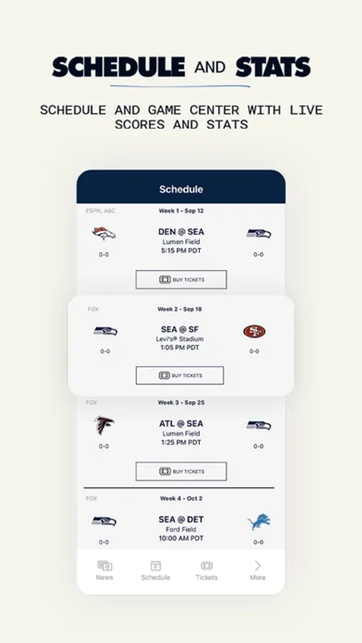 This is the official Seattle Seahawks Mobile App. Use your iPhone or iPad to stay connected with the team all year long. Team news, mobile tickets, in-stadium features, real-time statistics, video highlights, and more are available just a few taps away.