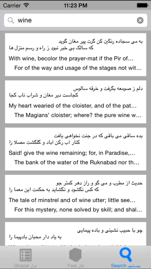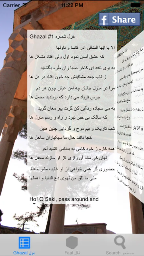 Additionally, the app includes search functionality that you could search all Divan to find special Ghazal. The results would let you browse the Ghazal.