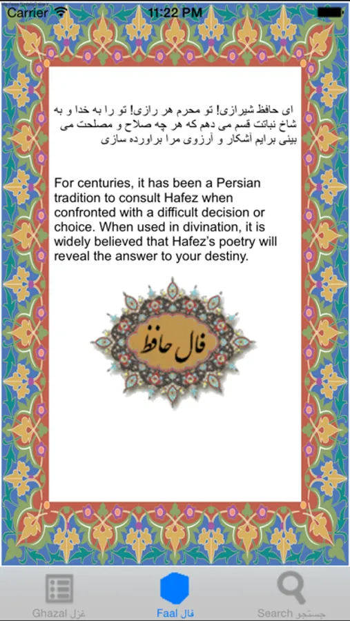 This app includes some of his poetries, with english translation. Iranian people have special tradition that when they want to decide about something, and they are not sure about what to do, or they want to see what would happen in future, they will use Hafez Divan (book).