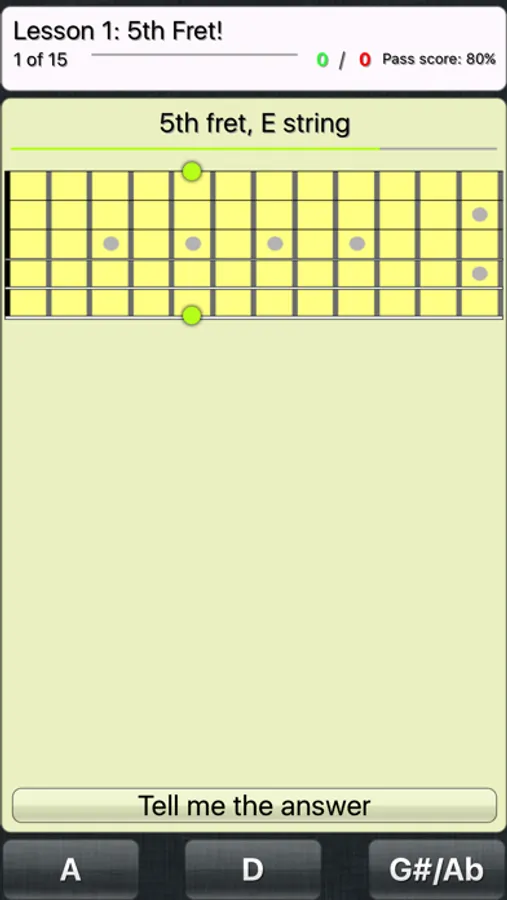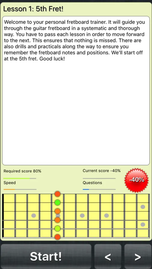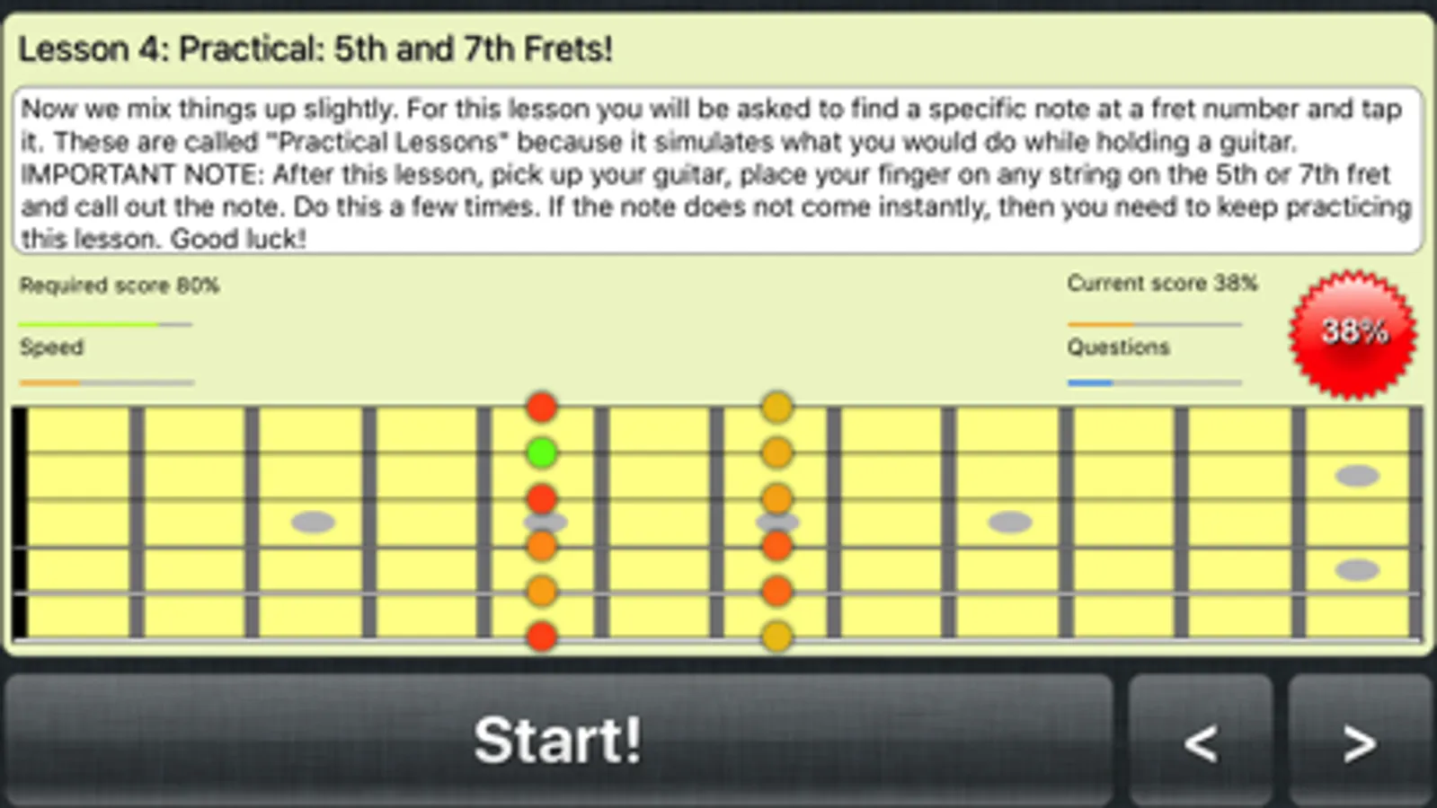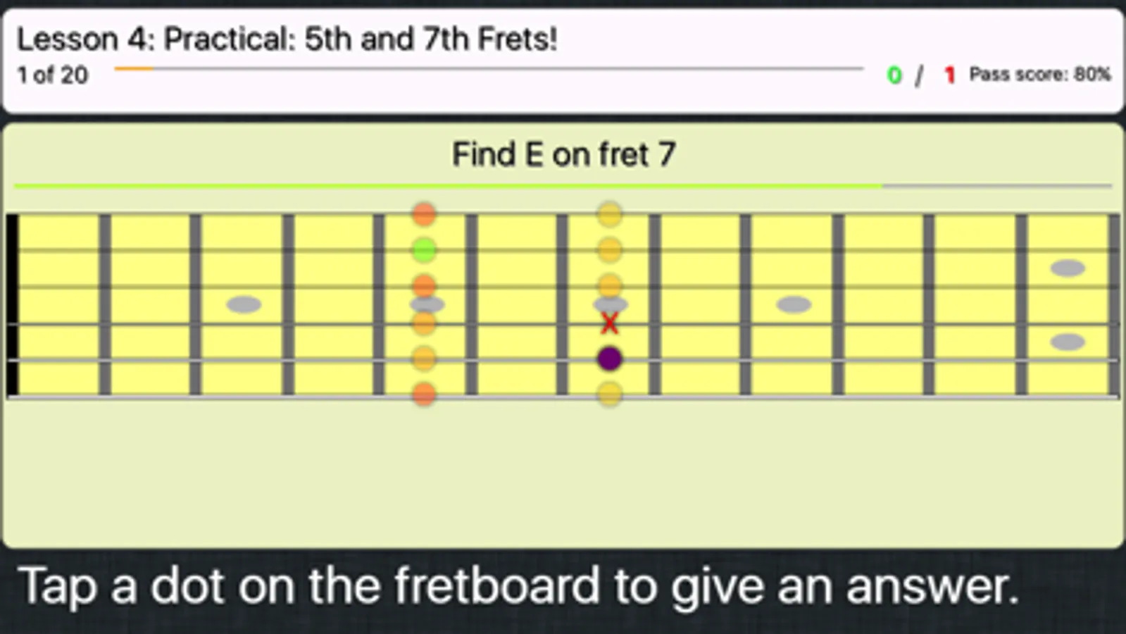 FretWiz features a total of 50 lessons which gradually build on themselves. The lessons are constantly challenging you with evolving questions and only allow you to pass if your speed and accuracy are considered high enough. The app intelligently monitors your answers, and focuses on the areas you struggle with most. This creates the "quickest route" to learning the entire fretboard in a fun, intuitive and intelligent way. There are different lesson types which vary in speed and qualifying pass mark. Some drills will be challenging because of their speed, but will be satisfying when passed.