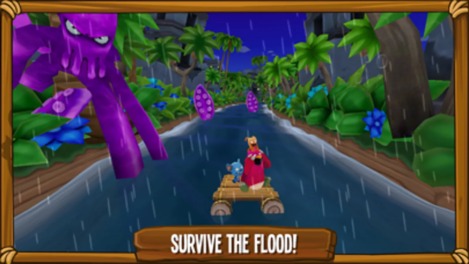Steer the creatures’ raft down perilous rapids filled with rocks, hungry crocs, snapping fishes, and Noah’s explosive barrels to out run the tidal wave behind you and catch the ark.