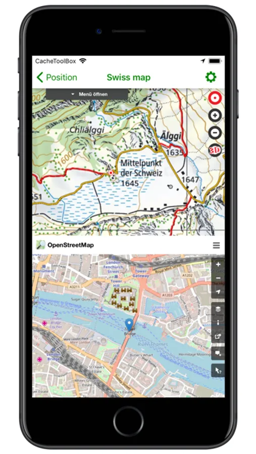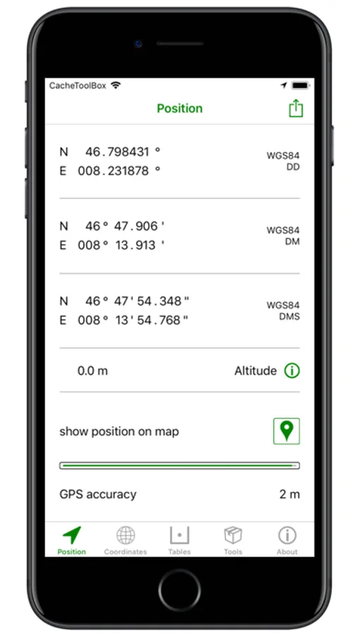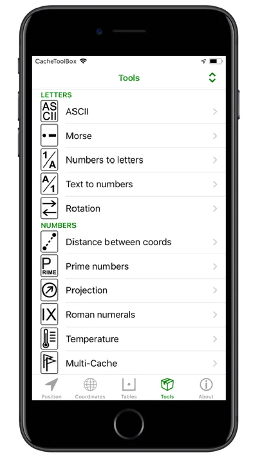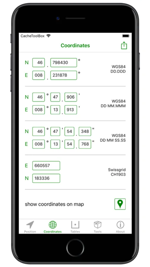 CacheToolBox is an ideal tool for all ambitious geocachers and hikers. The app offers conversions for the Swissgrid coordinate system in Switzerland and for various WGS84 formats. Furthermore, the typed coordinates or the current location can be displayed on the map. The map needs an internet connection. In addition, the app offers various tools such as ASCII, numbers to letters, text to numbers, rotation, bearing and distance between two coordinates, prime numbers checker, waypoint projection with current position, Roman numerals, temperature units, number systems, Wherigo Reverse solver, tool for Multi-Cache with calculator.