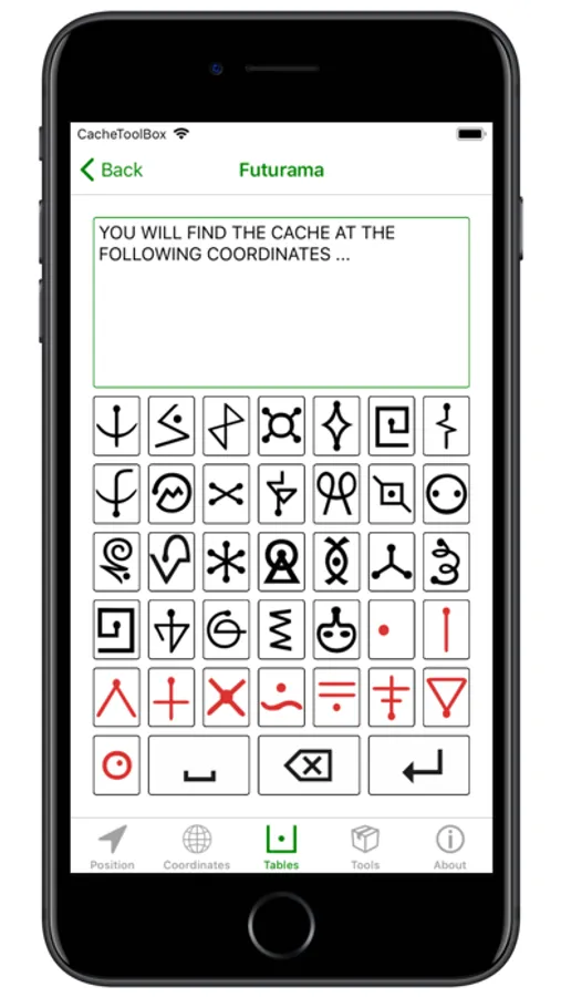 SwissGEO Tools was in 2012 the first app which had interactive code tables. The big collection of interactive code tables continues to be an important part of CacheToolBox. Outdoors, you can decode the encrypted messages smartly with the "symbol keyboards" which were displayed in plain text without any Internet connection. CacheToolBox now also offers the opposite way: simple encryption of plain text by keyboard in symbolic characters!