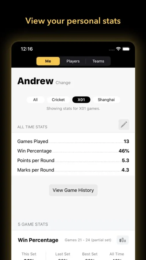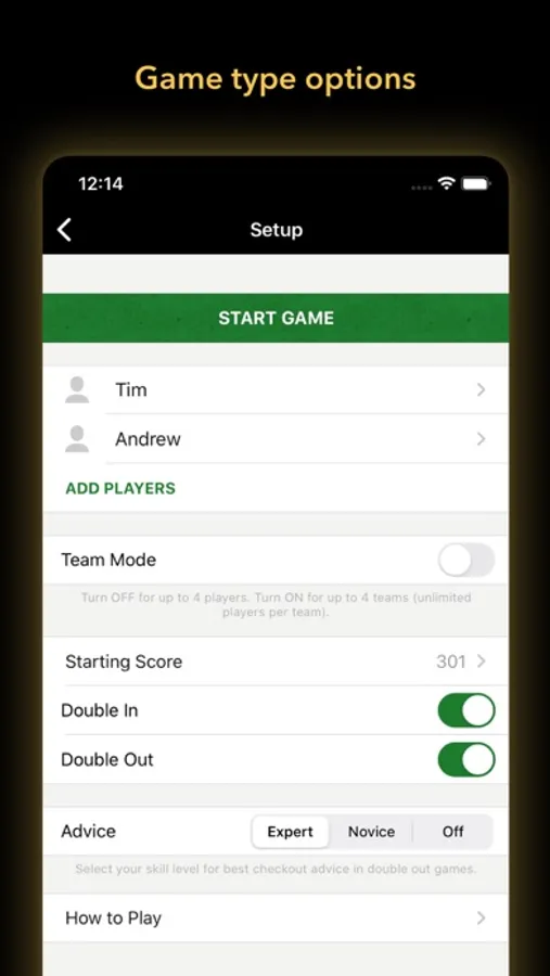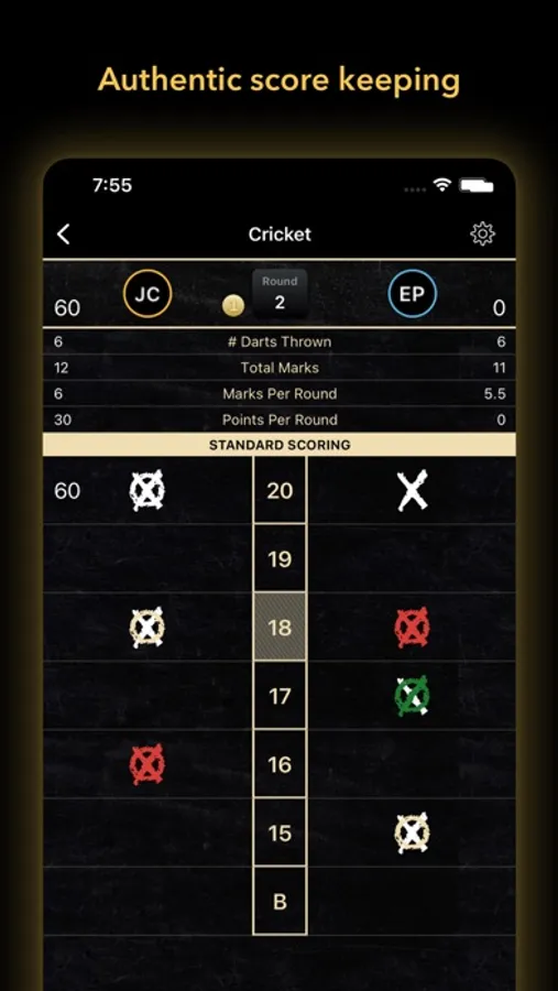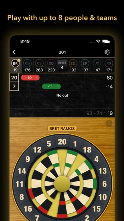 Score Cricket, x01 & Shanghai with up to 8 players or teams.