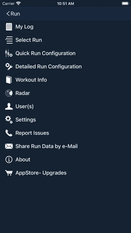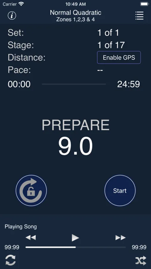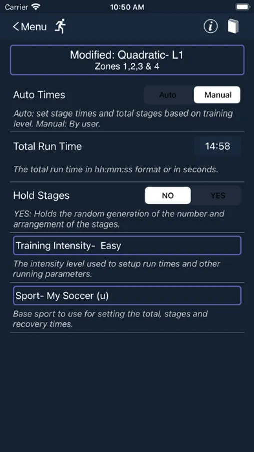 The App includes a "Quick Setup" to facilitate selection of run parameters based on the user's fitness or difficulty level.