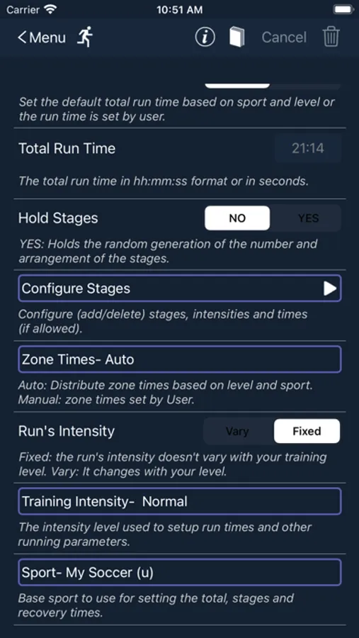Using the In-App Upgrades you can upgrade the App to include the Training Zones Module. This module allows you to configure a time distribution scheme and save it as a sport, which can be used it in any run as you use the default sports.