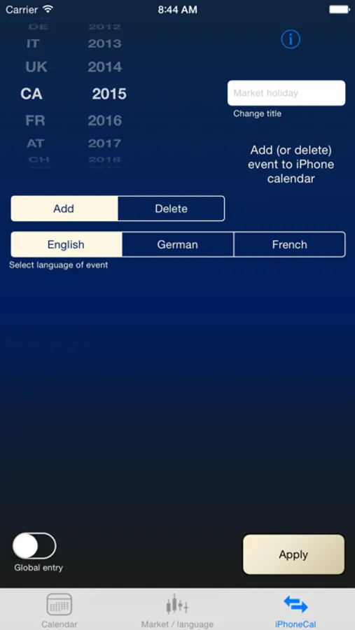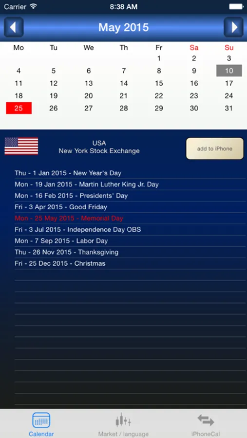 Stock exchange holiday calendar for the main markets in USA, Canada, Australia, Great Britain (London Stock Exchange), Italy, Germany, Austria, Switzerland, France, Japan, Brazil, Chile, Mexico. All stock exchange holidays until end of 2021. Multilingual: English, German, French. The selected market holidays can also be added to iPhone calendar.