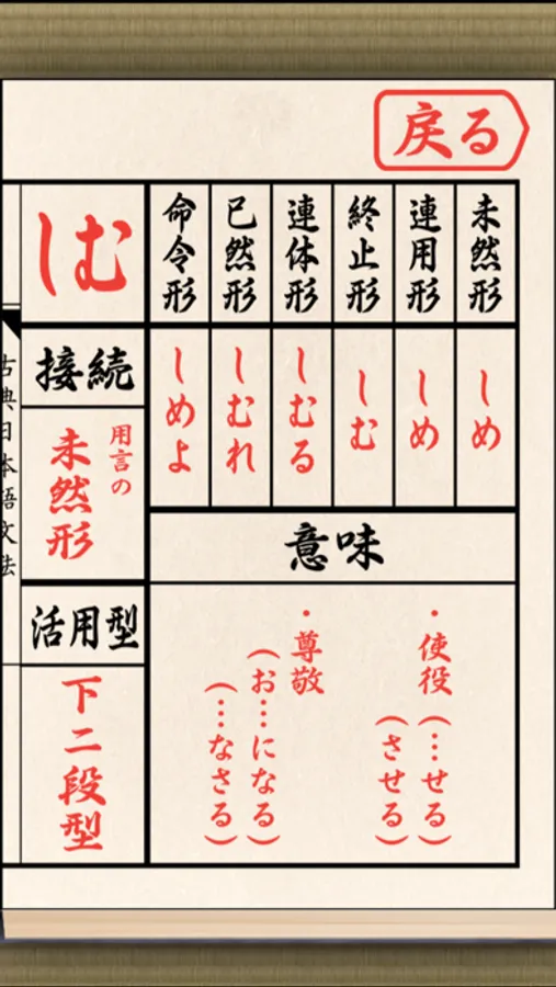 “Koten Bunpo” is the best application to master the depths of classical Japanese language. It contains the essence of classical Japanese grammar, classified into different sections and organised in an easy to comprehend way. This app is an amazing reference tool, aimed at school and university students dealing with classical Japanese literature and language. For exercise in comprehension we have also included excerpts from classical Japanese texts, such as “Makura no Sōshi” and “Tsurezuregusa.” We have also added a grammar test section, where you can check your level of knowledge.