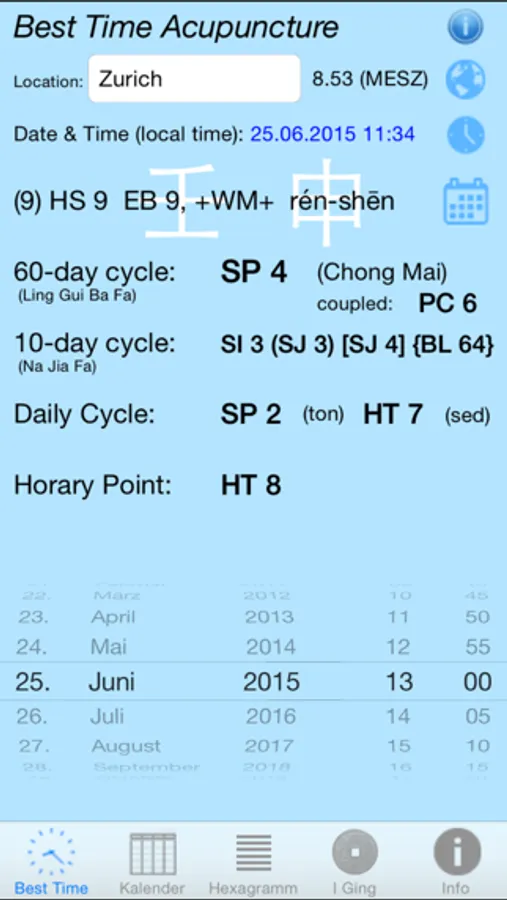 Based on the traditional Chinese Lunar calendar and following a 60-, 10- or 1-day cycle you determine open acupuncture points at a particular time.