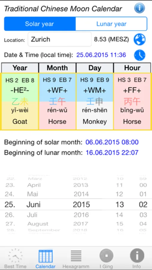 Use the traditional Chinese lunar calendar to calculate a constellation of heavenly stems and earthly branches on a particular day and time.