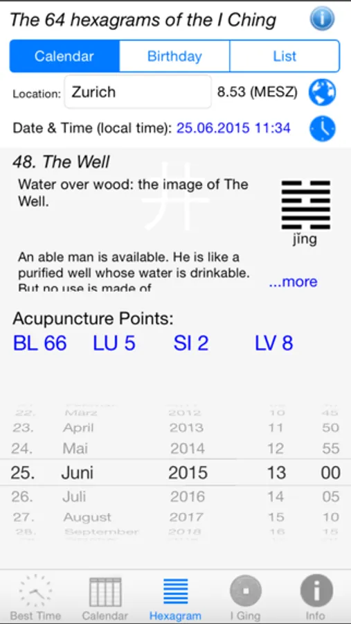 An additional calculation establishes a correlation between "birth hexagram" and related potent acupuncture points. The I Ching texts provide further insight into the calculated hexagrams.