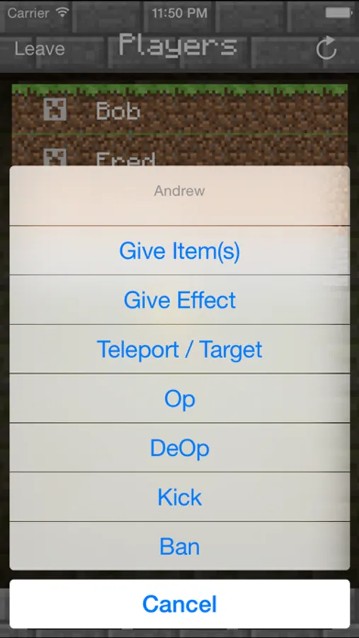 Interact with players on your server by pulling up the player list in-app. You can whisper messages to players, teleport them around and even give them items from an item-catalogue. As an RCON administrator, you also have the ability to kick and ban players connected to your server.