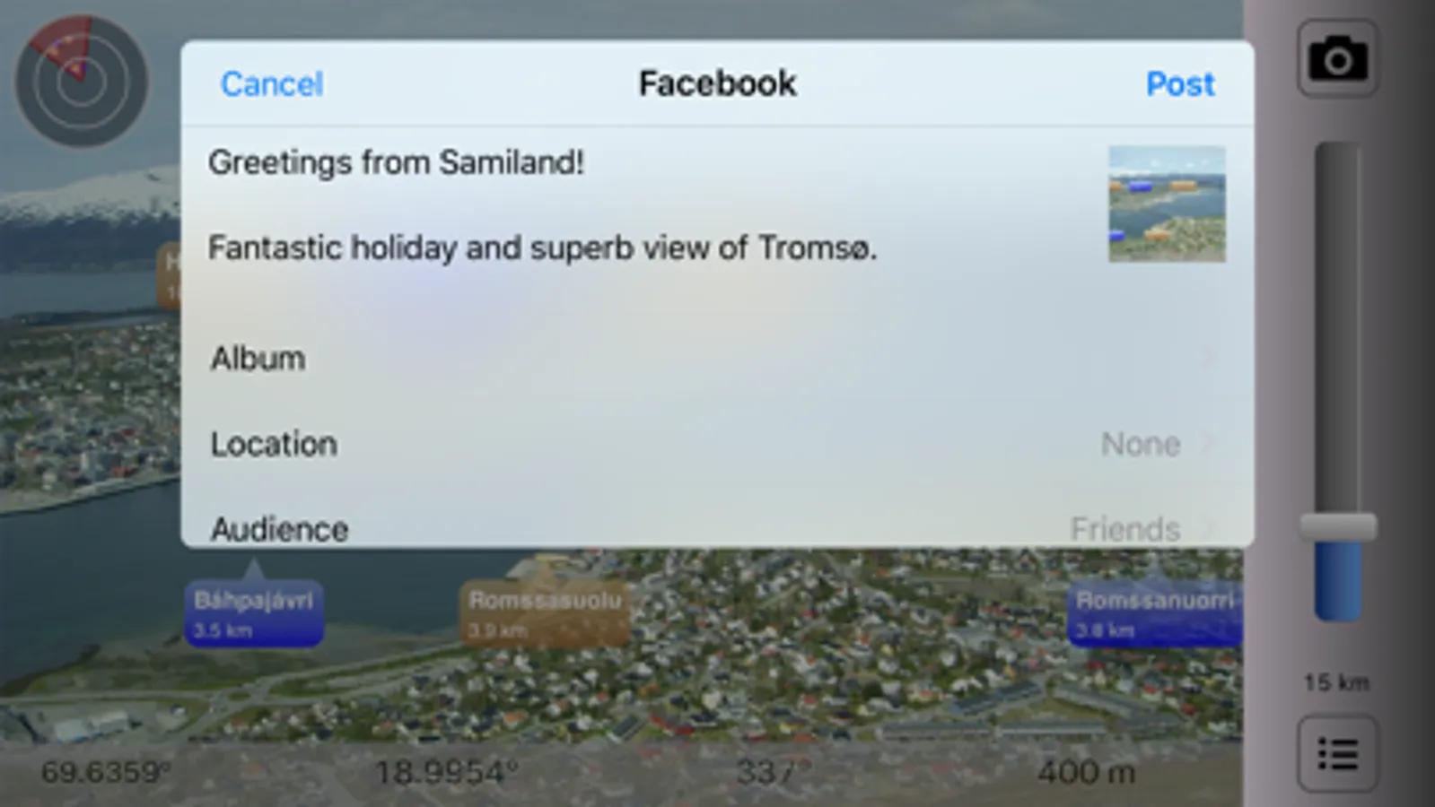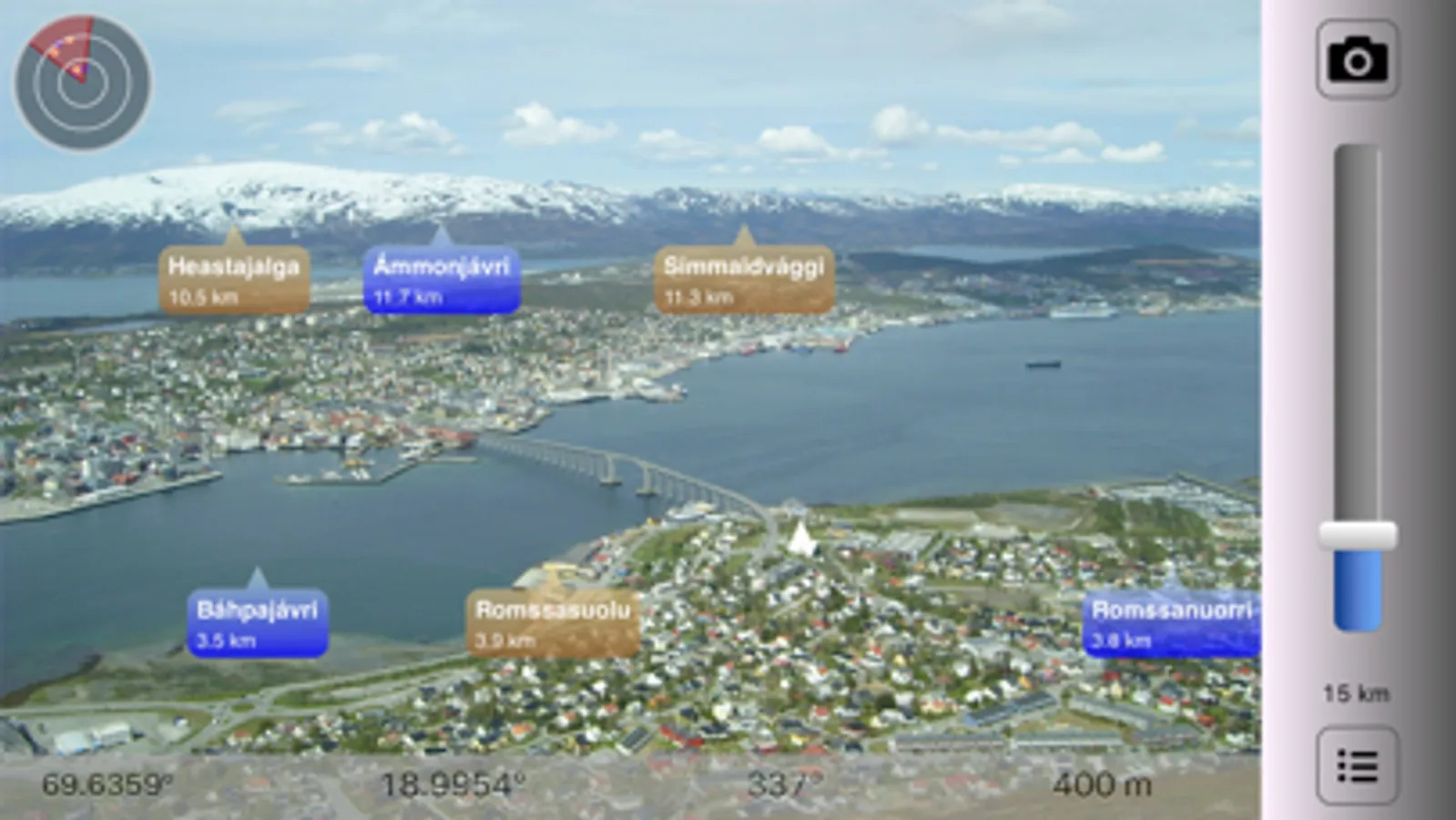 In Sight - Samiland shows Sami POIs in Norway. See what's near you where you travel in Samiland: Mountains, Lakes, Places, Buildings, etc. You don't even have to be nearby Samiland: You can manually set your location to a place in Samiland to pretend you are there. Decide if you want to see places nearby, or famous cities around the world.