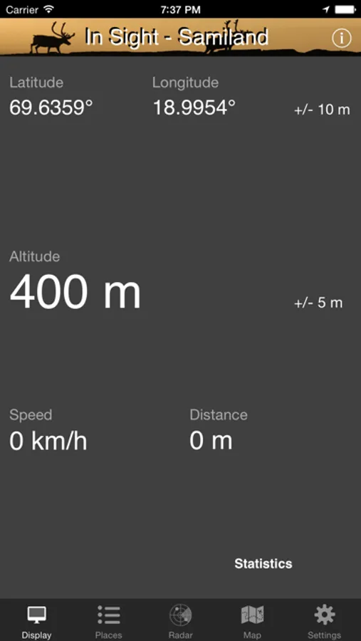 In Sight Samiland is also an altimeter, speedometer and also estimates the distance you've traveled. Choose between metric (km, meter) or imperial (miles, feet) units.