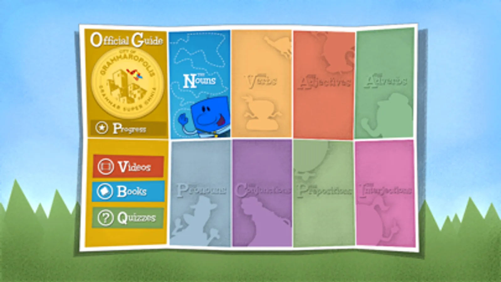 Your free download includes access to the Noun neighborhood. Let Nelson the noun lead you with a curriculum map that includes a song, a book, videos, and over 400 quiz questions. Follow the map to earn your badge!