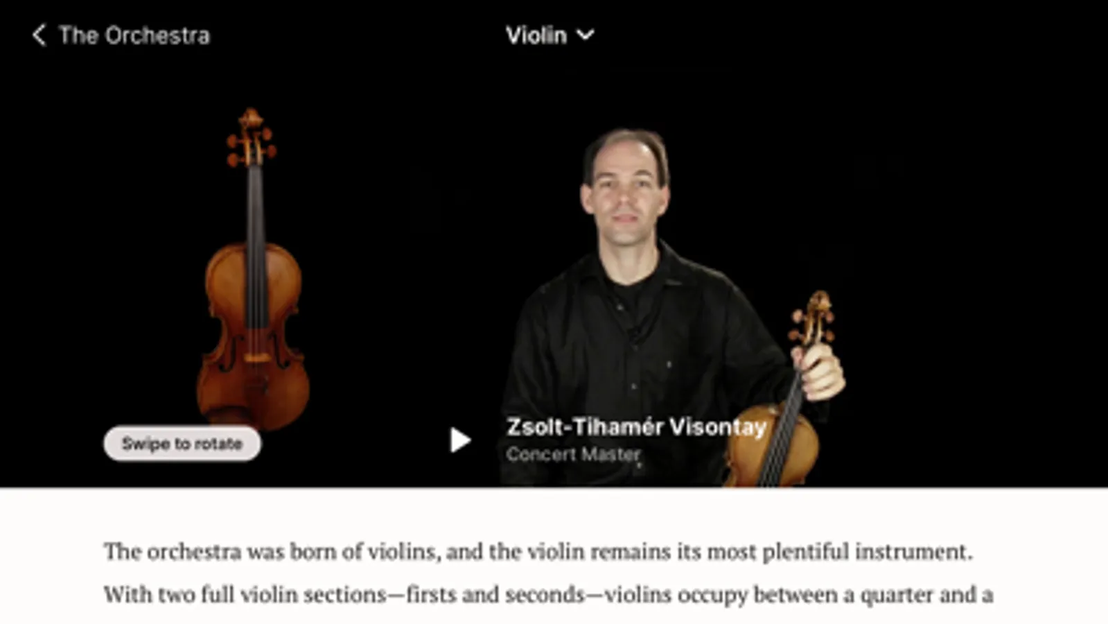 • Expert explanations: World-class musicians explain their role in the orchestra and demonstrate how their instruments work. Use a keyboard to play samples of the instruments, and view each one in glorious detail with 360° rotations.