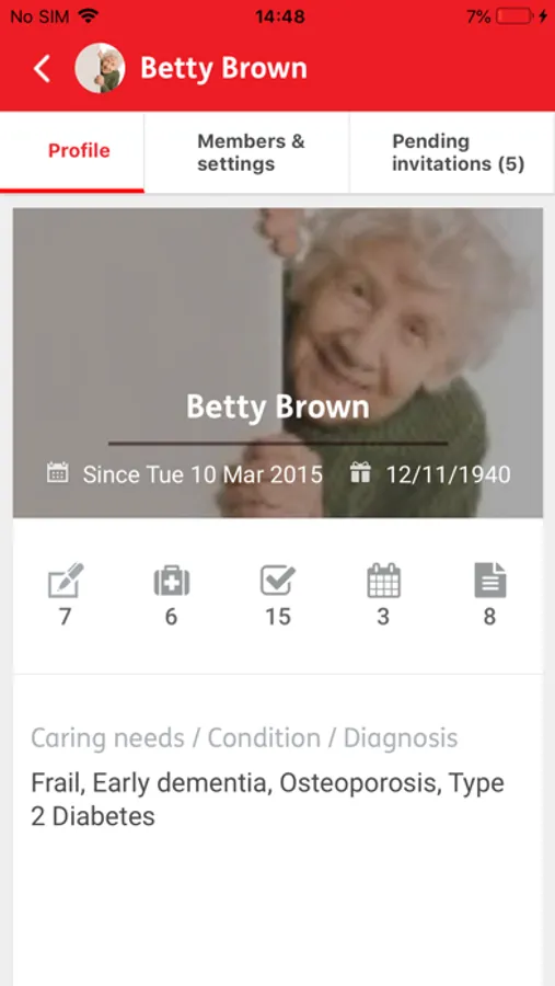 • Profile: Store useful information about the person you are looking after and have it available to access any time at a click of a button! Make a note of their date of birth, condition and caring needs, likes and dislikes or anything else you may think is relevant.