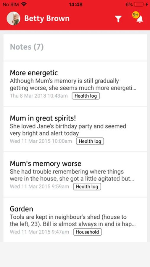 • Notes: You can use Notes to store a wide range of information and add images or document attachments. This can include bills and information about the household or how someone is feeling.