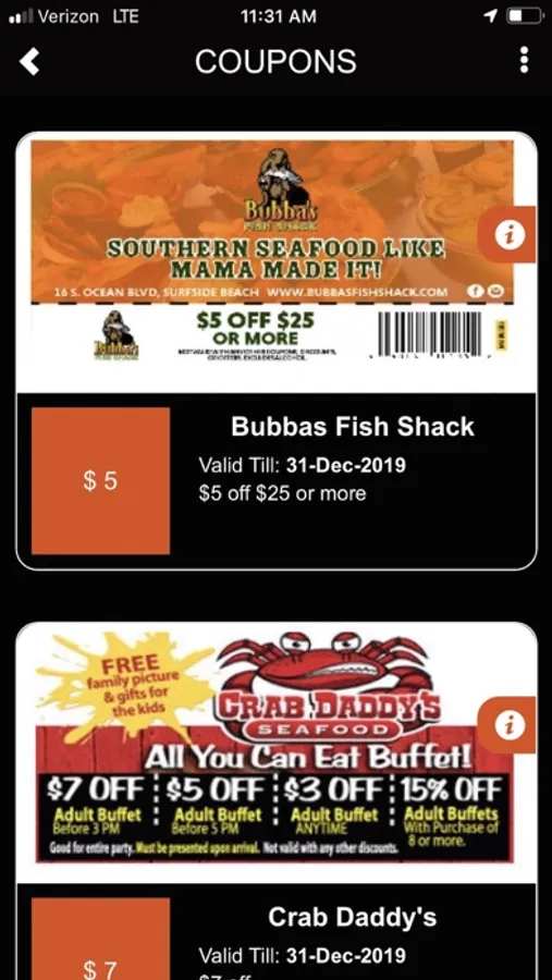 Browse for local business in any of the dining, attractions, hotel, nightlife, or shopping categories and automatically have the stores that are closet to your current location (GPS) displayed first. Once you find your perfect coupon simply show business the displayed deal (coupon) directly on your mobile device for discount. Watch live video of the Marshwalk and check out the events in the Inlet Area. Murrells Inlet is a short drive south of Myrtle Beach SC. Come and enjoy the Marshwalk and visit the local restaurants. Find your best Charter Boat Fishing Guide and do not forget to visit the crab cake lady.