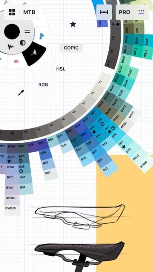 • The full COPIC color spectrum, RGB and HSL color wheels