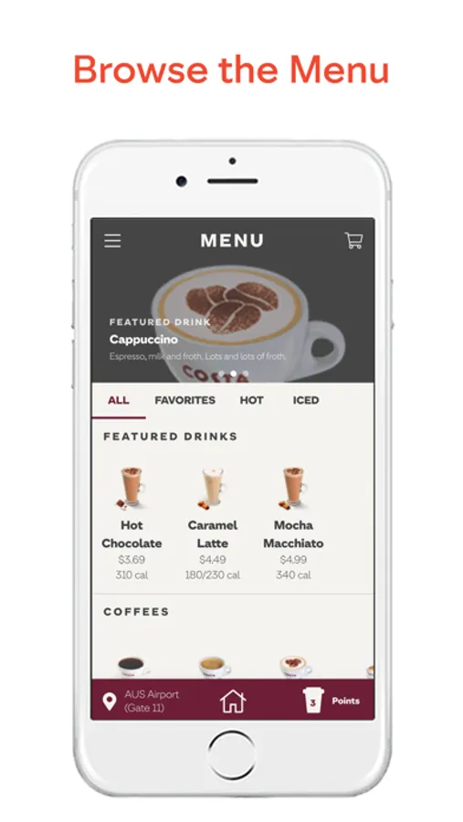• Browse our menu of coffees, lattes, teas, and non-caffeinated drinks