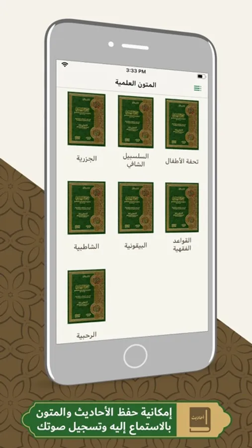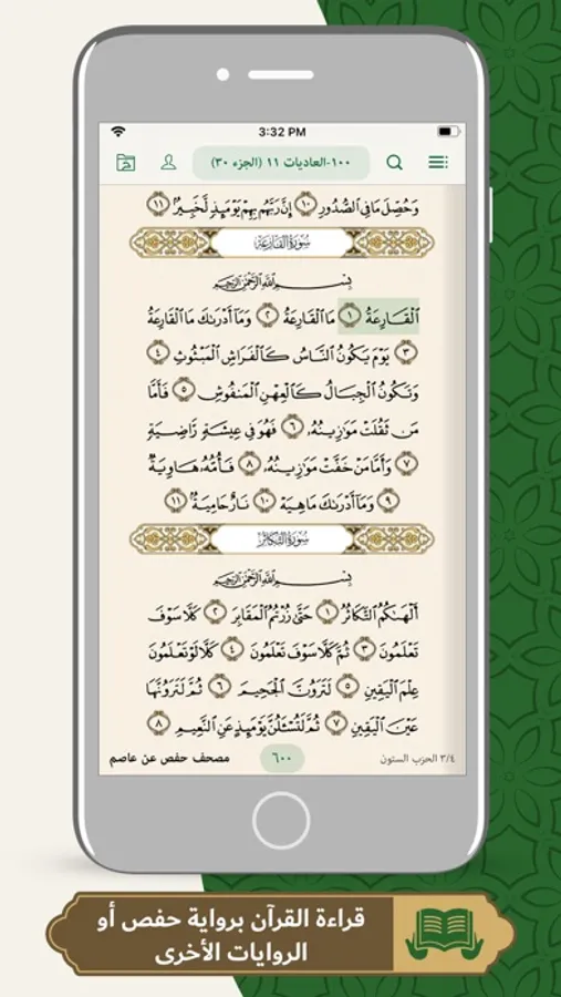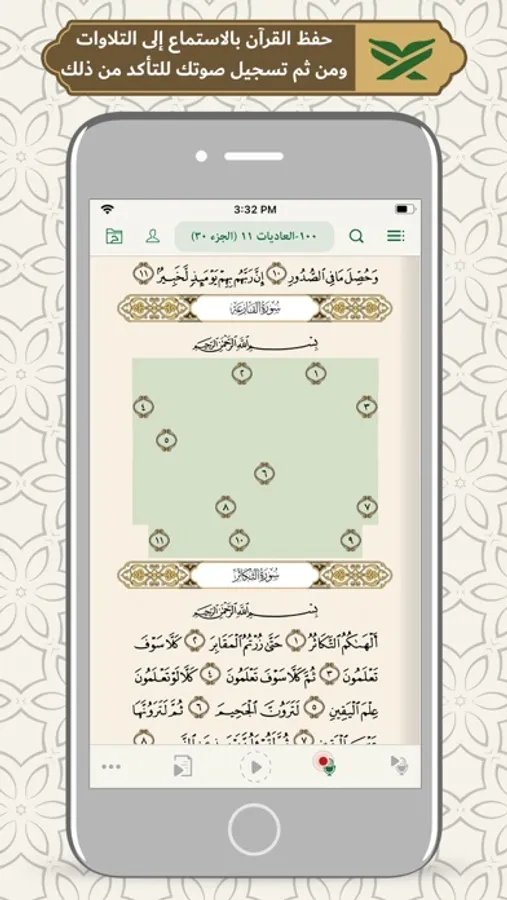 Elmohafez app allows you to memorize the noble Qur’an according to the different qira’aat while using the Uthmani script. It also helps you memorize the Prophetic Sunnah and the mutoon (brief Islamic texts) in an easy way. All you have to do is choose the text, read it and listen to the recitation, and then record your voice as the text disappears. After the recording, the application shows the text along with your recorded voice for you to compare it and know how correct it is. You have the ability to follow your progress of memorization of the Qur’an or the books of hadeeth, and you can listen to your recording at any time.