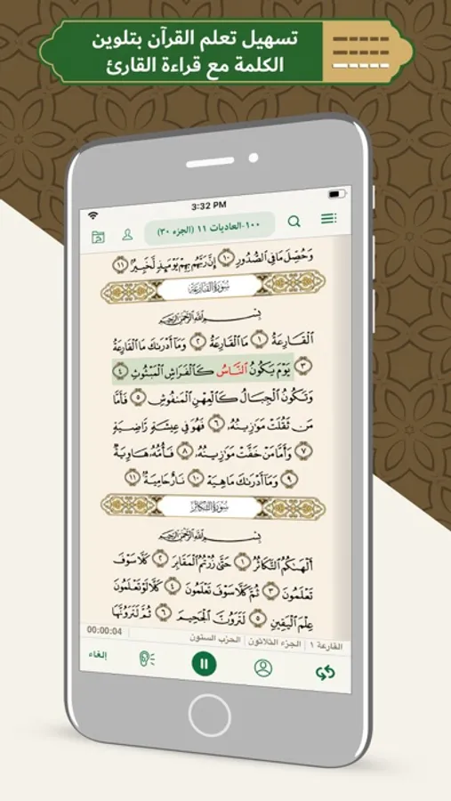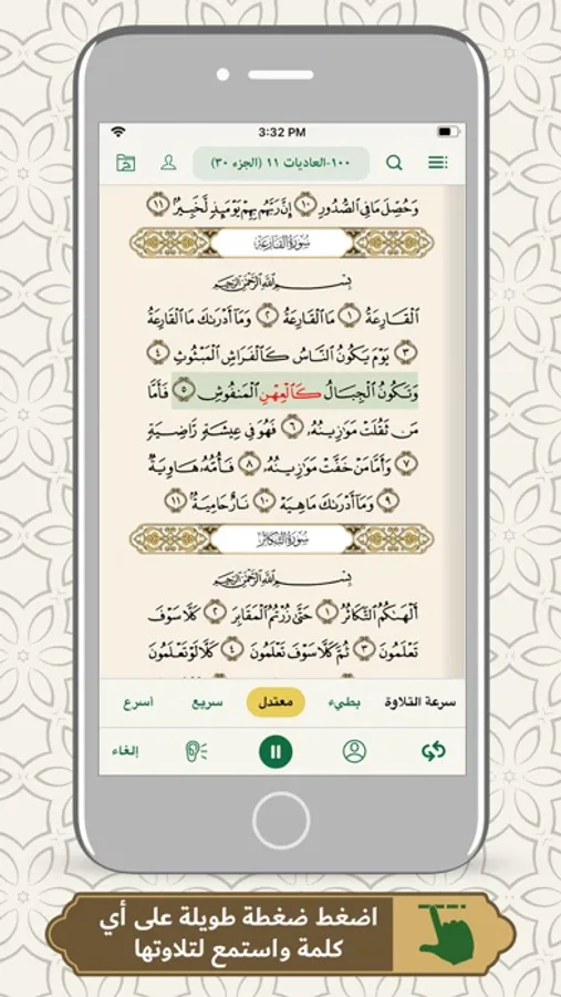 - إمكانية الضغط على أي كلمة وسماع تلاوتها بشكل منفصل