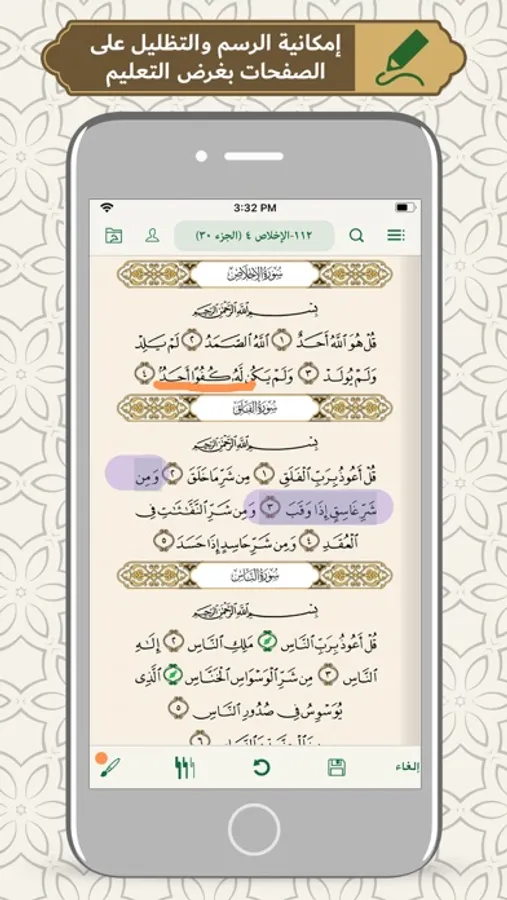 - إمكانية الرسم والتظليل على صفحات القرآن الكريم بغرض التعليم