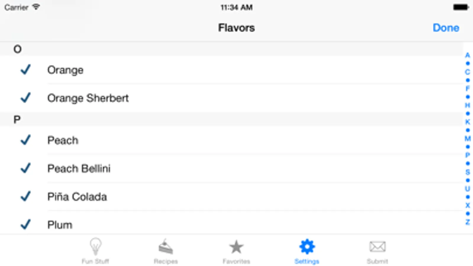Don’t like certain flavors? You can remove them by touching “Choose flavors” in the “Settings” tab and uncheck them so they will not show up when you search for recipes.