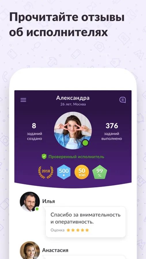 Все исполнители YouDo проходят верификацию и дополнительно могут подтвердить свои документы. Вы видите только реальные отзывы за выполненную ими работу и место в рейтинге.