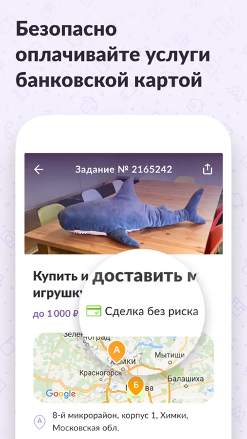 Вы сами определяете цену задания. У нас нет посредников, поэтому услуги исполнителей обходятся на 30-40% дешевле, чем у сервисных компаний. Самый удобный способ оплаты — Сделка без риска. Деньги списываются с банковской карты заказчика и резервируются до успешного завершения задания. А если работа не будет выполнена — вернутся на карту.